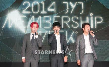 @韩国me2day【naver综合】’2014 JYJ MEMBERSHIP WEEK’展示会上的JYJ.金俊秀’这次membership week已经是第三个年头了.现在心情和第一次办的时候是一样的.这是为了支持我们到现在的粉丝们所办的.’金在中’我们的准备希望可以让粉丝有个特别的空间.努力让粉丝感叹,感受到幸福,朴有天’能为粉丝朋友们做的其中之一的membership week开始了.能举行本身就很感谢.正是有了每次都过来的粉丝,活动才能举行’