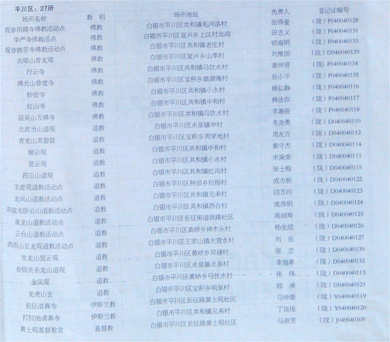 白银市宗教活动场所公示名单