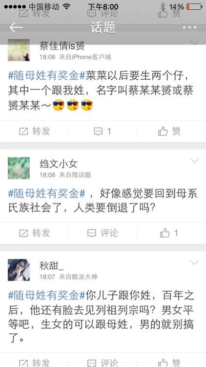 大家可以去看看微博上的“随母姓有奖金”话题