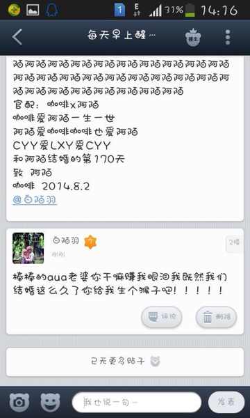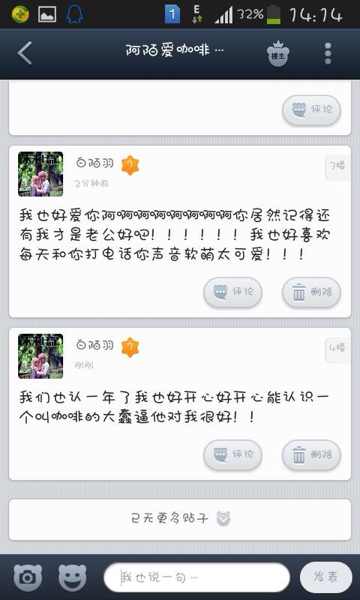 亲爱的 我早上看见了你给我企鹅发的 贴吧发的 也就你这么单独给我发这些了 当时看的眼睛湿润了 今天七夕 我都快要忘记我们在一起多久了 你还记得 180天了呢
