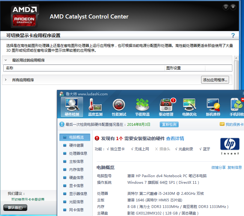 回复 莜面卷儿的哭泣 :如果是催化剂的话就从新下载 ,我是在软煤下的纯净系统W8.1 惠普官方下的主板驱动F.1C,在inter下的芯片组驱动核心显卡。还有这个AMD催化剂也是AMD官网下的 ,安装后完美运行。