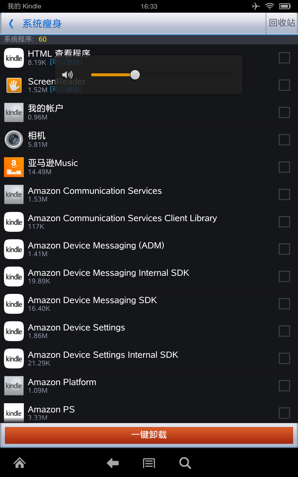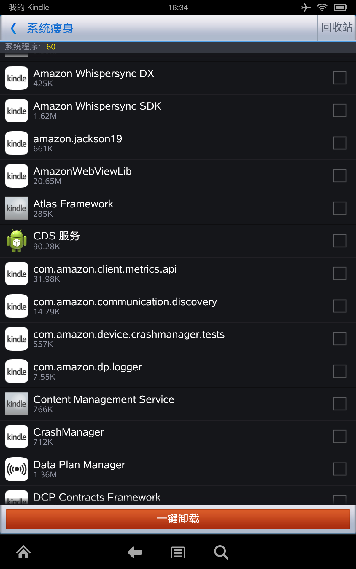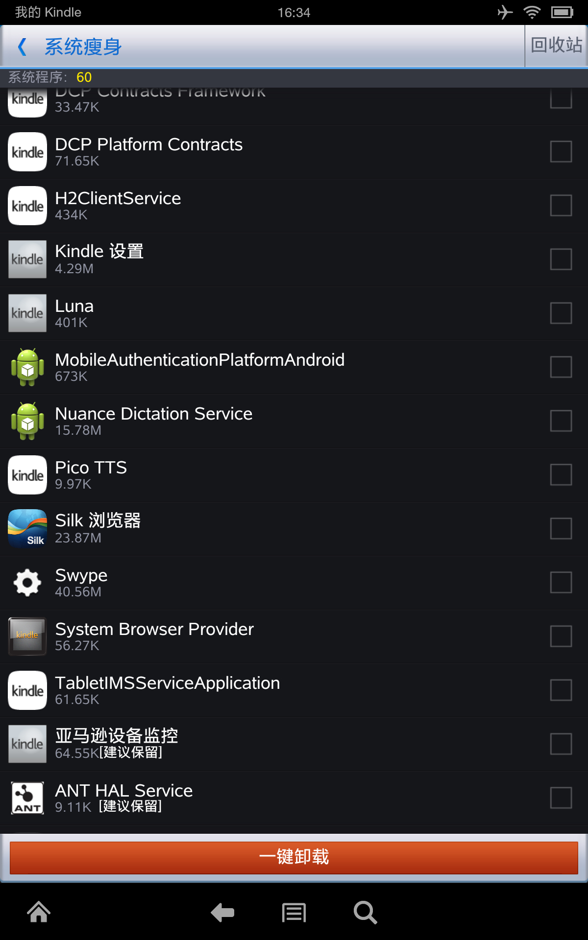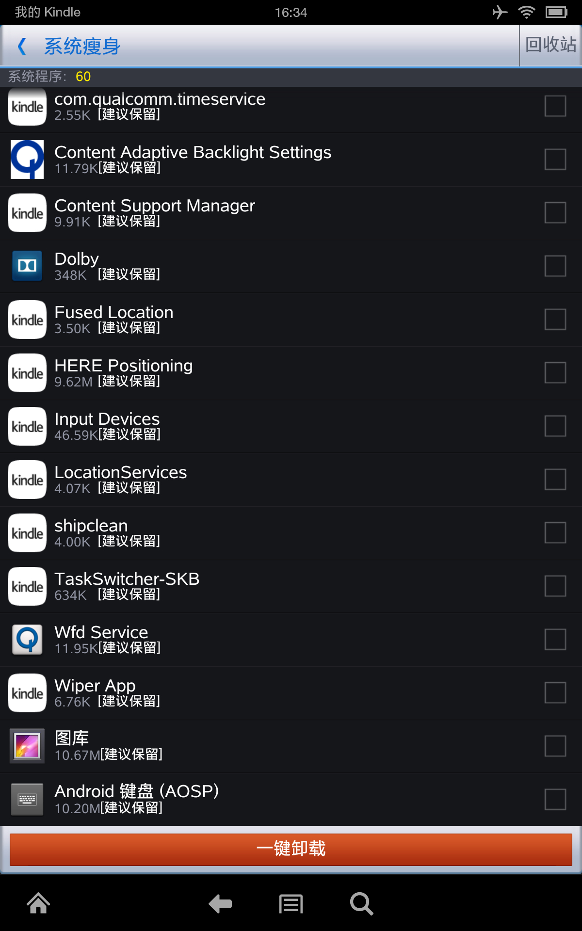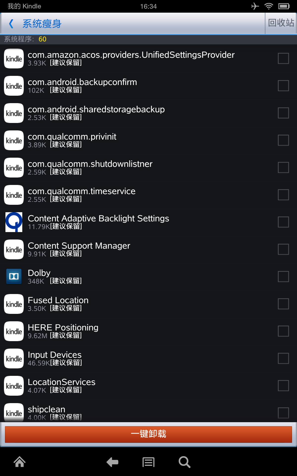 图片为经本人验证精简后剩余的程序,将不在列表中的程序删除就行了(要保留“主页”启动器项,截图中没有!)。P.S.刷入nova启动器/原生图库 如果删除程序后出错将中亚上下载的最新升级包update-kindle-13.3.2.4_user_324002120.dat后缀名改成rar打开,解压出要安装的apk用豌 豆荚等安装重启机器就行了。用360优 化大师精简,kindle只保留浏览器和音乐,其他的自带程序和全部在线服务都不能用了,慎重。