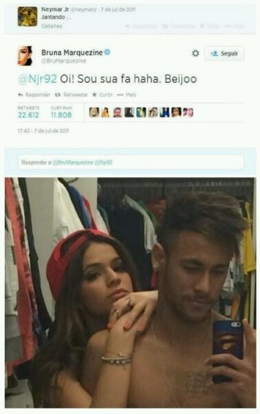 三年前,15岁的布鲁娜·马尔奎兹尼发了一条推特@ 了内马尔:你好,我是你的粉丝,哈哈……现在,她成为了内马尔的女友。