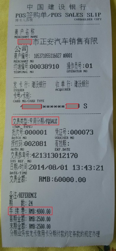 合同签署是贷款申请的第一步,这时候缴纳了3000定金,7.28日周一将合同复印件和信用卡号交到银行,加上前面签的贷款申请书,开始申请分期车贷。7.31日,第四个工作日贷款审批完成,去4S店缴纳首付、保险,开发票,拿首付收据、发票、保险复印件给银行,银行审查后第二天将6万元额度授权给信用卡,8.1日刷卡完成交易。