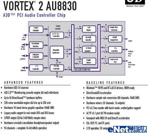之所以不说“群雄并起”,是因为一直到2002年SE-80PCI发布,把娱乐声卡直接带入110DB + 24192时代之前,4年里最强大的DA一直是那片ISA声卡上的PCM69。3D音效大战也好,YAMAHA靠MIDI来蹚浑水也好,ESS、Cirrus和Philips出来打酱油也好,不肯提升音质是这个时代的主流!不肯提升音质的原因,就是对AC97的迁就和计算机系统的软件DSP还不够强大。