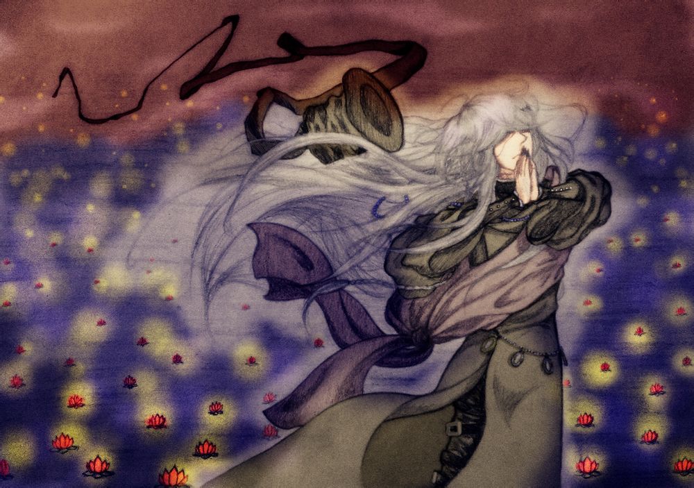 一地簇拥的莲花,围着他绽放。每一朵都是他对逝去的人的思念。生命太漫长,他有一些可以活得短暂但是精彩的人类朋友,都给他留下了美好和欢乐。他爱这些人,感谢有他们的陪伴,尽管很短暂,但是他很知足。