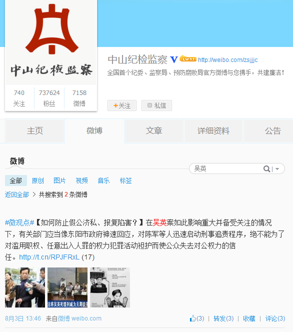 chinese7在这里发了一张手机截图,内容是广东中山市纪委、监察局官方认证新浪微博对吴英案的评论。