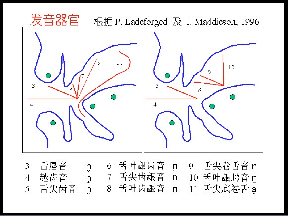 主动发声器官:唇、舌尖、舌叶(舌尖两侧)、舌身、舌根、声门