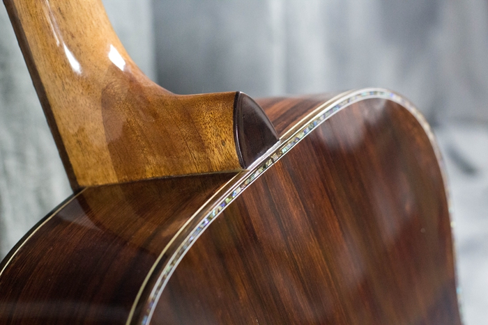 琴型是OM琴型,英格曼云杉+马达加斯加玫瑰木配置,拾音器用的丽声L&M MIX 1音孔+贴片拾音系统