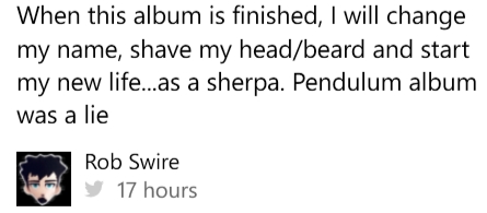 原文:Rob-如果这张专辑很失败的话我会改掉我的名字,把胡子和头发剃掉,像个夏尔巴人一样生活,PENDULUM的新专是假的