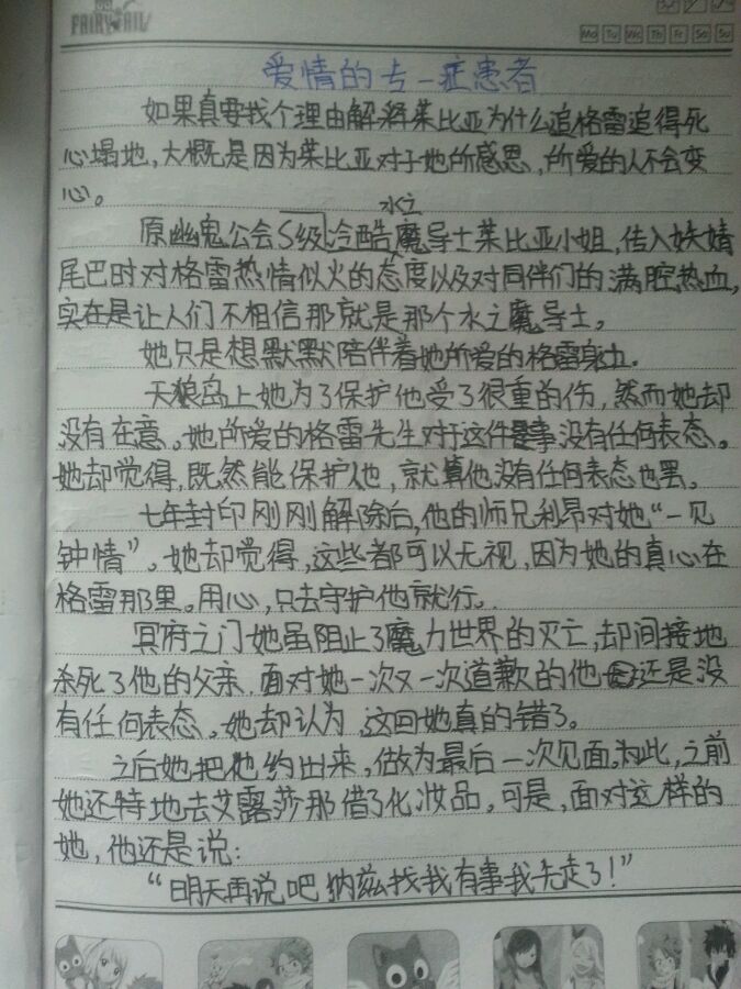 好赞!!!!楼主才六年级么?!!我好羞愧。。六年级的时候我还在写着佐樱小白文。。。。楼主写的很棒哦!而且字也很棒!!!而且最佩服的是我写文手稿会被我涂涂改改弄得一塌糊涂。。虽然是长篇。。。。。。]但是楼主手稿好干净。。。。。。。很赞哦!加油~