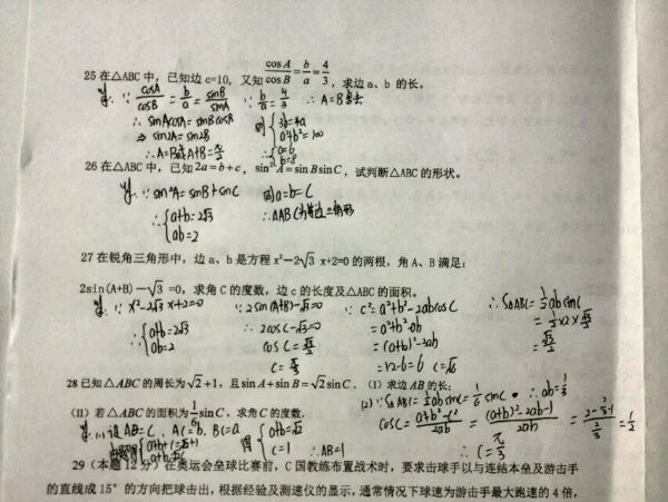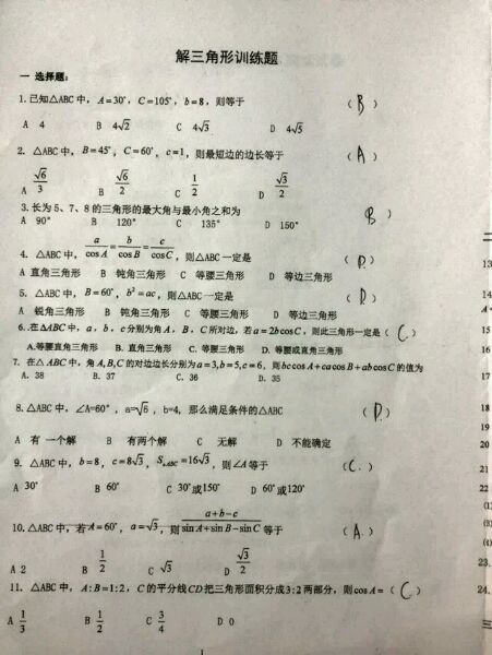 高一升高二,求数学卷子答案:解三角形训练题,必修五1(照照片