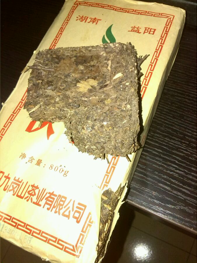 上面那裸茶是94年安化茶厂的茯砖,相信茶品和这个应该也差不多,现在一块不足300克的可卖500块左右。