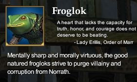 蛙人是一种身材低矮的两栖类种族,原产自诺拉斯的沼泽地,对拥光者Mithaniel Marr抱有强烈的忠诚。长期以来,蛙人和Innothule湿地的巨魔之间纷争不断。大约四百年前,他们的神灵对部分蛙人施与祝福,使他们拥有更高的智力和更强健的体魄。在此后不久,巨魔被蛙人从城市Grobb中驱逐出去。为了彰显主神的荣光,蛙人将此地更名为Gukta,意为Marr的前哨。在在建筑和图案设计方面,蛙人保留了对起源的忠实,他们并不在意装饰物,更乐意用那些让他们回忆起沼泽家园的装饰物围绕着自己。尽管他们的建筑又矮又胖,蛙人实际上是健壮而聪明的种族。他们有能力胜任任何职业,只要和他们与生俱来的善良信仰不冲突。