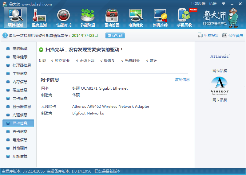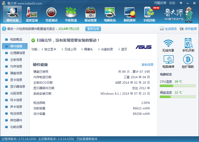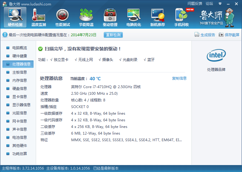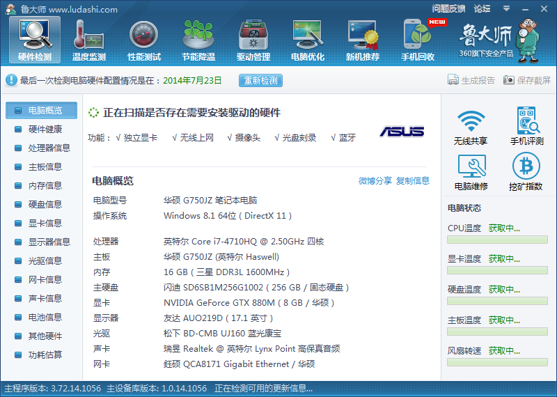顺便附上了跑分过程中的温度,上面的图片点击大图看鲁大师温度窗口即可