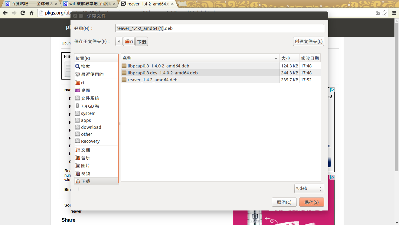 另外安装系统ubuntu14.04以及一系列破解工具比如aircrack,minidwep等都不在本贴中赘述了,百度有很多,也可以直接在终端使用命令"apt-get install 软件包" 来安装,不过不要安装reaver,本贴主要讲安装reaver和库文件