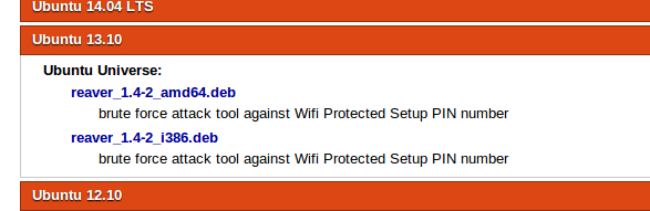 下拉找到Ubuntu 13.10那一栏,看清是13.10,虽然我们的ubuntu系统是14.04,但我们要装旧版的reaver和库文件,这里是下载reaver