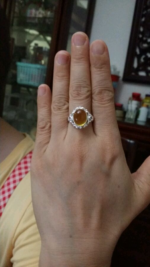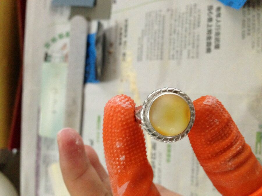 接下来看看戒圈是什么样子,然后要依据戒圈的大小形状来选择料,比戒圈要大出来一圈(大概三到五毫米)的料子就比较合适了,小了很容易空,太大的又废料。我选了一块之前锯下来的珀,快有点大,应该可以做两个戒面的~所以还是要用上锯子