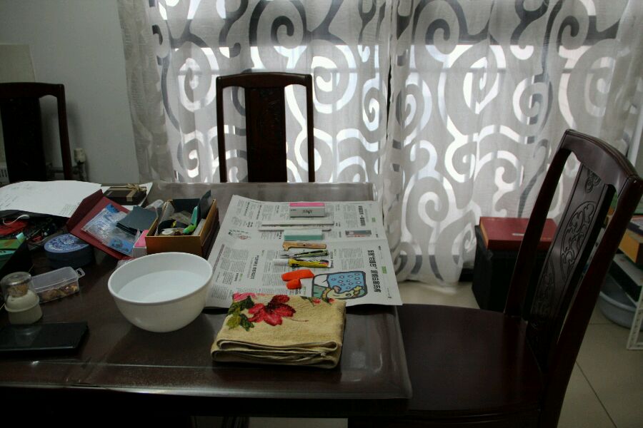先给大家看一看我的简易工作台~其实就是我家的饭桌啦~纸板加上报纸就行啦~水也是必不可少的~