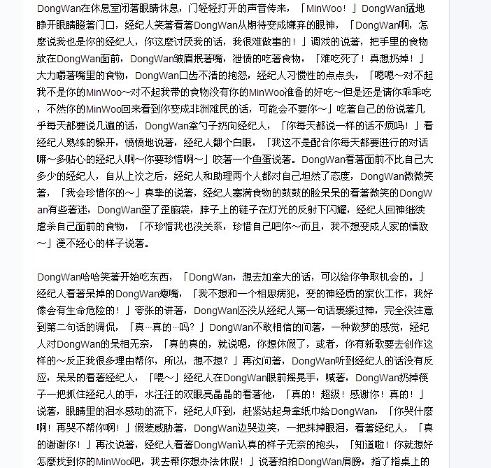 MinWoo淡定的揉了揉DongWan的脑袋,「就是换了一个工作,新工作呢,就是无时无刻都待在你身边照顾你~」MinWoo看DongWan满脸搞不懂的样子,「我就是你新的贴身助理啊~」轻声对DongWan说,「别⋯开玩笑了!」DongWan木讷的样子不敢相信,看著MinWoo微挑的眉和认真淡定的双眼,「你⋯说真的啊!」很确定MinWoo没有开玩笑,「你搞什麼啊!之前的工作要怎麼办啊!」明显变的有些慌张的样子。MinWoo叹气,「别担心,工作我交给信得过的人了,那麼大的公司我会处理好的,可是你更让我担心,行程那麼多,为了避免我工作的时候都想著你好不好,我还是自己看著你比较放心~」伸手握著DongWan的双手,DongWan眉毛纠在一起,「这样真的没关系吗?」依然有著顾虑,MinWoo捧著DongWan的脑袋,在他额头上落下一个亲吻,「相信我吗?」轻声说,DongWan看著MinWoo的双眼,慢慢点了点头,MinWoo笑著亲吻了DongWan的双唇。