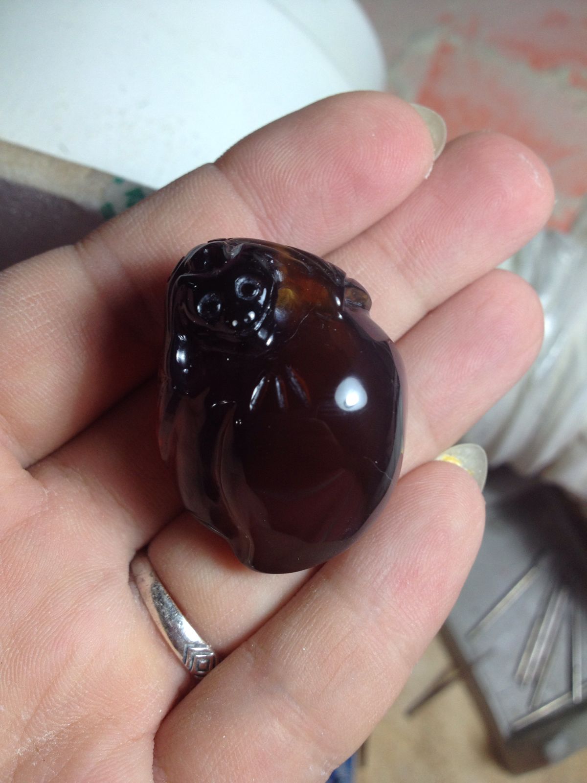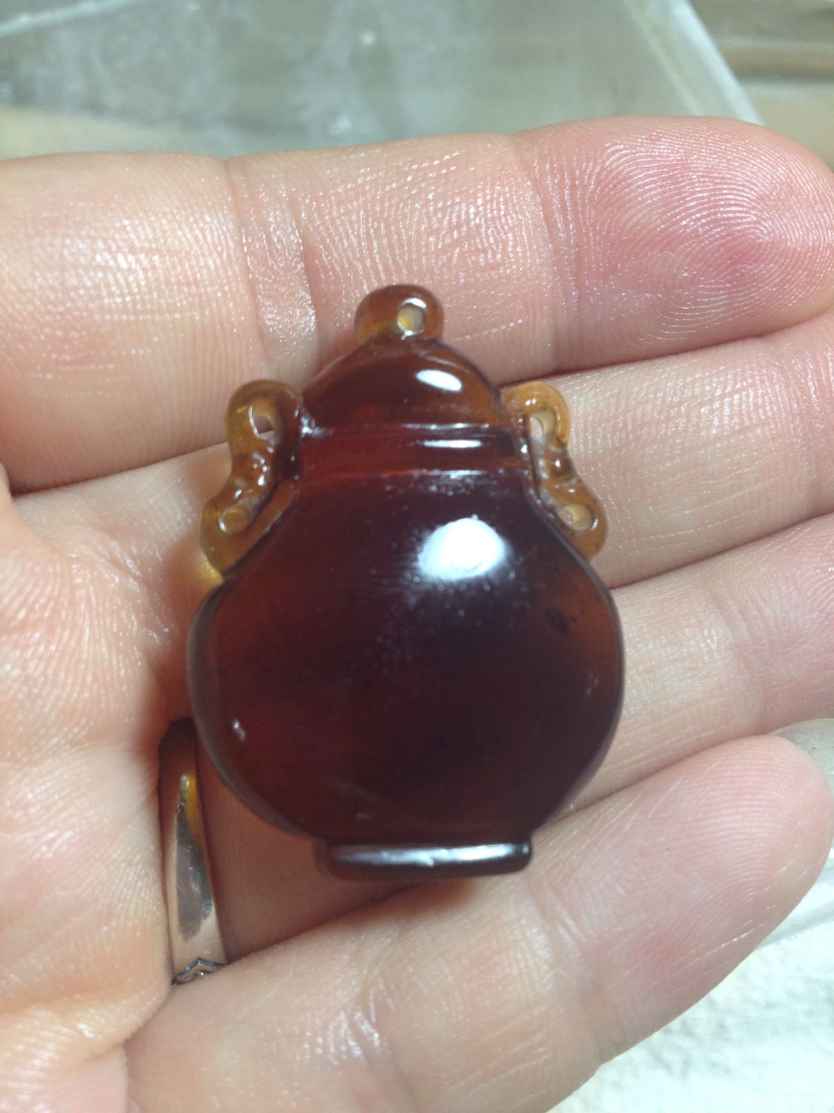 还是缅甸琥珀,第一个是宝瓶,料子不够厚,成品有些扁,第二个是福寿桃,自己觉得抛光好像进步了。
