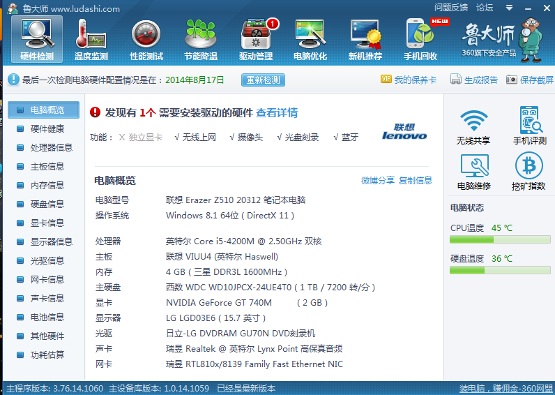 楼主 你的电脑鲁大师评测的软件信息里面硬盘怎么是1t 7200转的,别人的不都是5400转的吗?