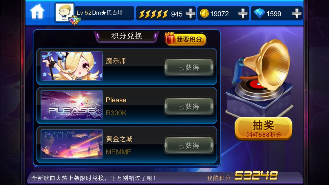 积分是刚更新2.3.1那个版本时没有外挂时候PK赢来的,当时7w多现在抽奖换歌什么的花了2w,钻石后来188有bug的时候刷了点,500是之前PK剩的,自己刷了不到1000钻吧,懒得弄也没刷多