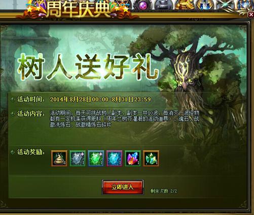 图1点击游戏主界面上方的“周年庆典”点入最后一栏你马上开启园丁之旅!在8月28日到8月31活动期间,玩家可以每天挑战树人副本。副本一共10波,每消灭一波怪物都有一定几率获得肥料,魂石,战徽洗炼石和战徽精炼石碎片等珍贵道具。肥料作为本次活动的重要道具,用以向世界之树施肥从而获得海量道具。