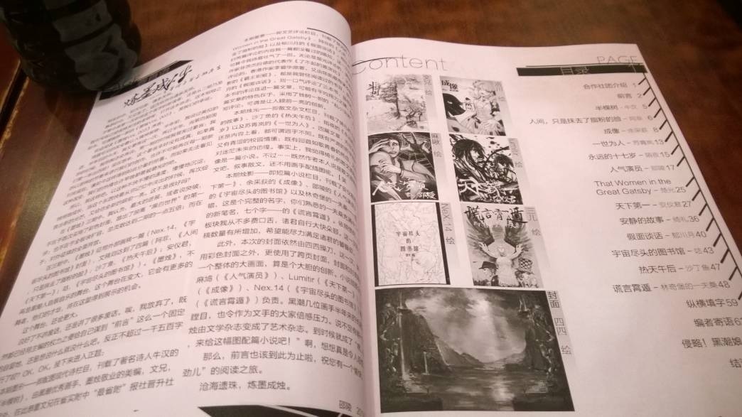 杂志的内容主要由配图现代诗、文艺评论、杂文&散文、小说,以及纵横填字等附加内容构成。分墨形、墨意、烛光、烛影四个板块。封面、插图以及所有文章均由社内文手画手倾力炮制,实现完全自产,维护写手、画师的劳动成果及知识产权。