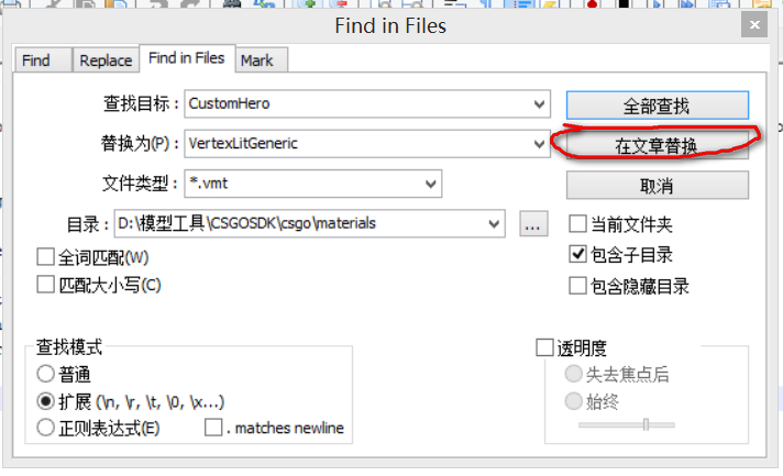 在查找目标一栏中输入CustomHero,替换为一栏输入VertexLitGeneric,文件类型为*.vmt,目录为CSGOSDK\csgo\materials,其他的要跟图片上的一致