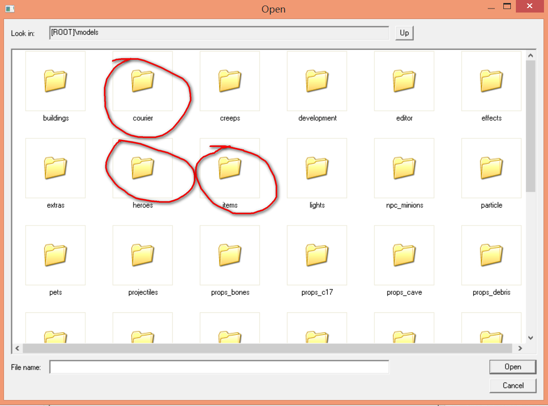 三个圈起来的courier文件夹里是信使模型,heroes里是英雄模型,items里是饰品模型,效果图如图示,