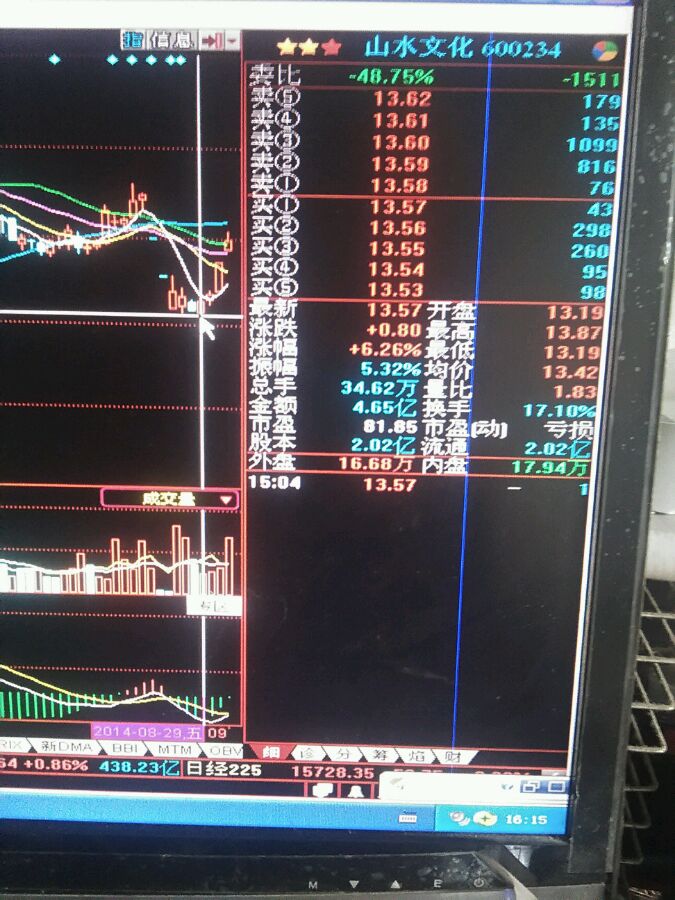经历这一次亏我学乖了,不能全部杀进去,应该留一点钱补仓,锁定下一个股票600234山水文化,听着名字很好,这货从19.19一直跌到10.80跌一半了,已经快跌出翔了,我11块买了300股,11.32就卖了,赚了几十块钱,尼玛现在13.57少赚600多块