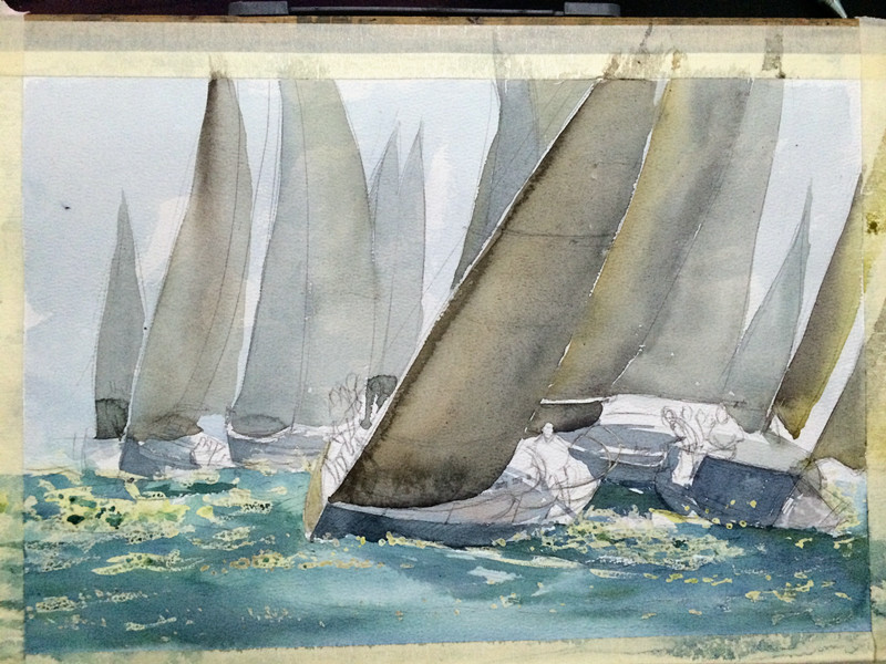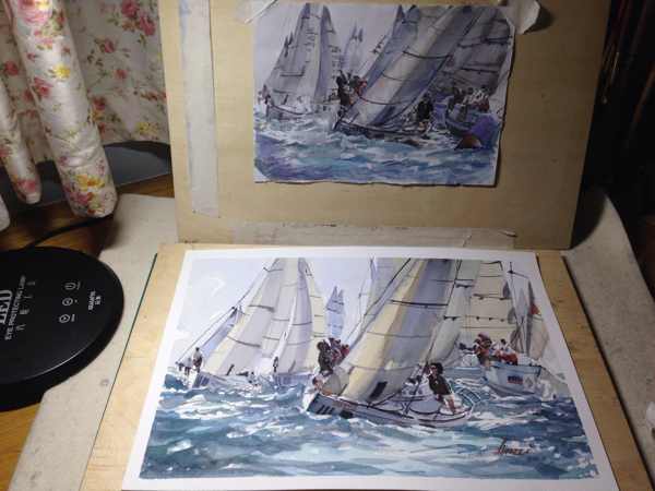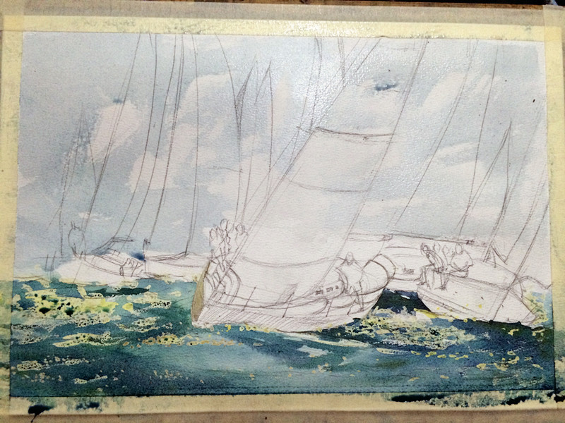 这次的重点就是开头最近的那两艘船!和这乱七八招的海面了!画这样的海面还是用到留白胶!这样好把握点!大家也能看到了!留白胶是点缀浪花的!当然你后期有高光笔或者白颜料也可以!看自己的吧!