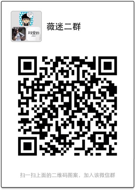 之前一群满100人后,好多朋友反应加不进来,我拉的话也得需要开通微信支付,操作起来很麻烦。所以,又新建立了一个薇迷微信二群,欢迎没进来的朋友扫描二维码来加入,手机党也可以加我微信,我拉你们进来,我微信号是106784653,谢谢大家哈