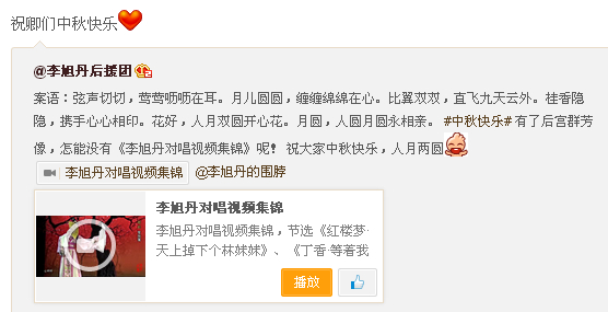 有了后宫群芳像,怎能没有《李旭丹对唱视频集锦》呢! 祝大家中秋快乐,人月两圆