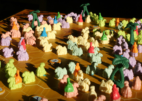 玩家有6个版块,作为手牌,这些版块的目的是发展文明,扩大他的影响力.玩家按照规则去放版块.版块可能给玩家获得分数.该王国有一个和版块同色的领袖就可以加分,没有领袖有国王,国王可以加分.