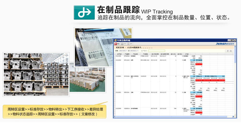 转序是指生产完成后,产品向下工序转移的过程。通过车间工控机自动打印转序工票【带条码】,送货到下工序,下工序人员使用PDA移动接收,有时根据物料情况使用FRID感应接收,系统记录整个转移过程,并提供各个环节使用时间。转序有利于及时发现在制品呆滞,提醒管理人员进行解决。系统接入了执行监督模块,还可以自动监控并处罚。