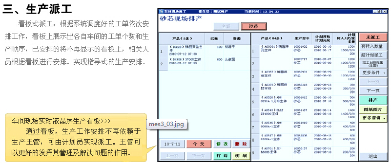 看板式派工:根据系统调整好的工单依次安排工作,看板上展示出各自车间的工单个数和生产排序,已安排的将不再显示看板上,相关人员根据看板进行安排,实现指导式的生产安排。