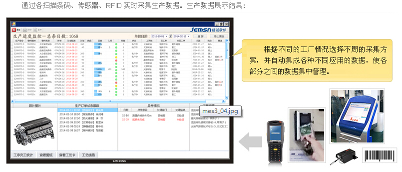 通过各扫描条码、传感器、RFID实时采集生产数据。生产数据展示结果: