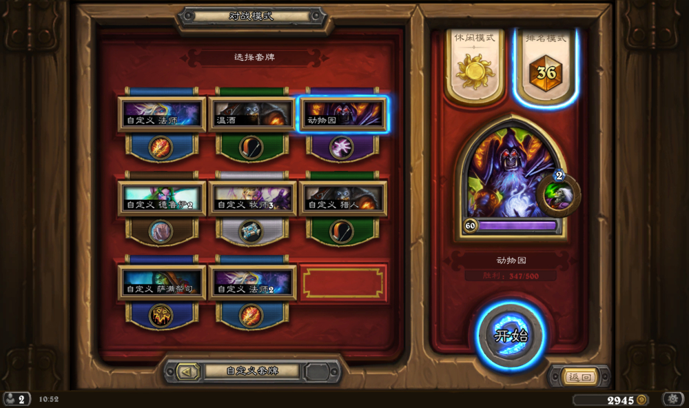 1,用的是动物园卡组,相对来说平民些,可绝不是无脑,玩的多了就有体会对各职业留什么牌、先后上什么、如何构思COMBO、对面可能的动作和对策·~~~~~~~这里必须对那些说动物园无脑的,请认真体会下这游戏的乐趣