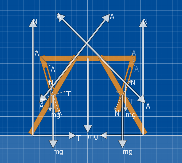 也就是说,一部分桌腿的趋势使得钢筋向左位移,一部分使得钢筋向右位移。钢筋是固定在支撑腿上的,如果要靠重力使得那部分开合角>90度的桌腿开合角变小,需要使得开合角<90度的桌腿上的切向力在开合角>90度桌腿上再次分解后的切向力大于直接由支持力分解出来的切向力。这...不嫌麻烦的话,可以算算,总之一般的结论是只要一部分桌腿在打开到最大的时候开合角能够>90度,这个桌子就是很稳定的,而且桌面上的压力越大,桌子会越稳。