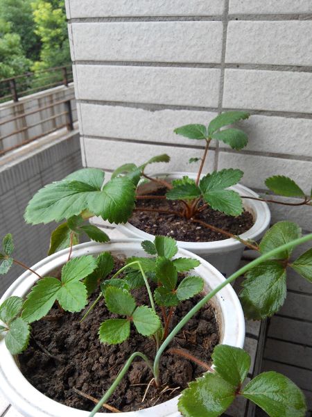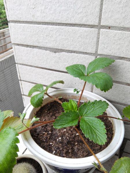 我有一盆草莓也这样长2小手,但叶梗不是红色,是白的,我也不知道什么品种。