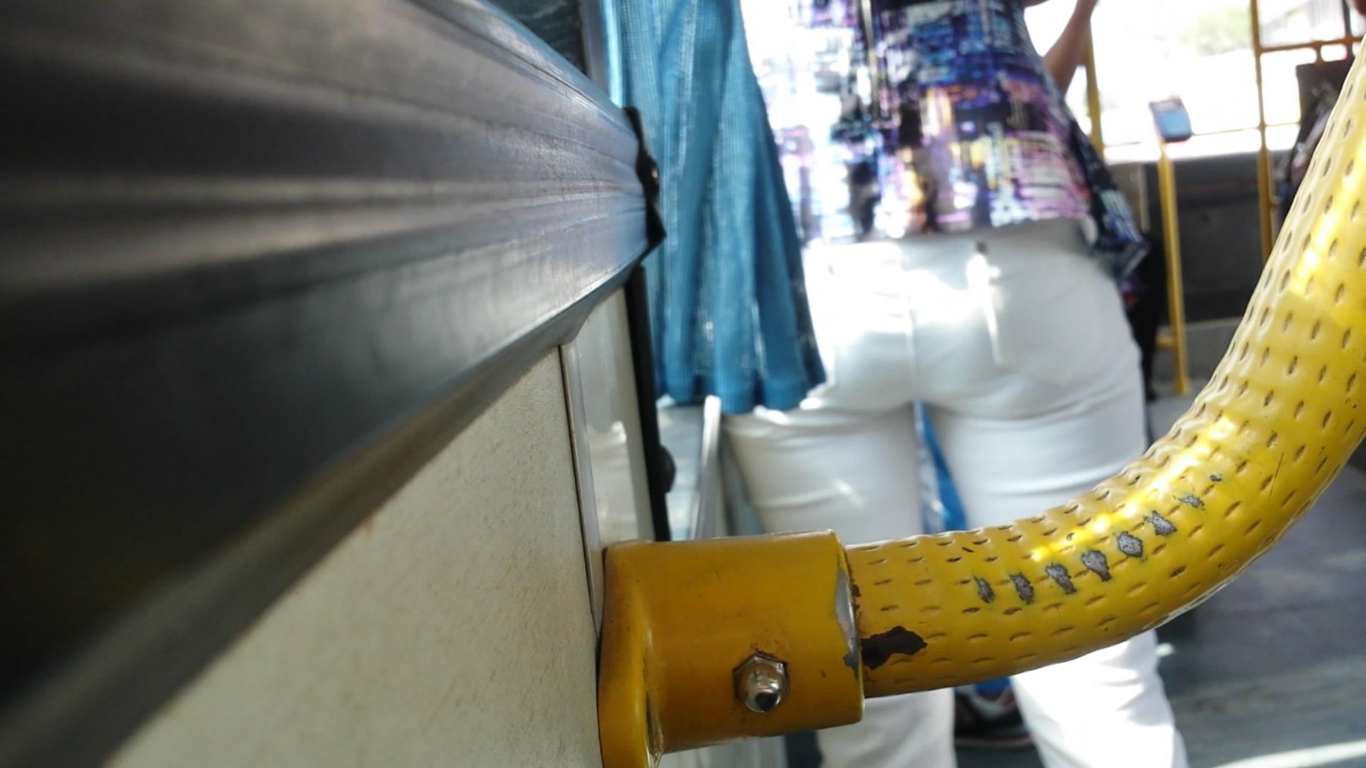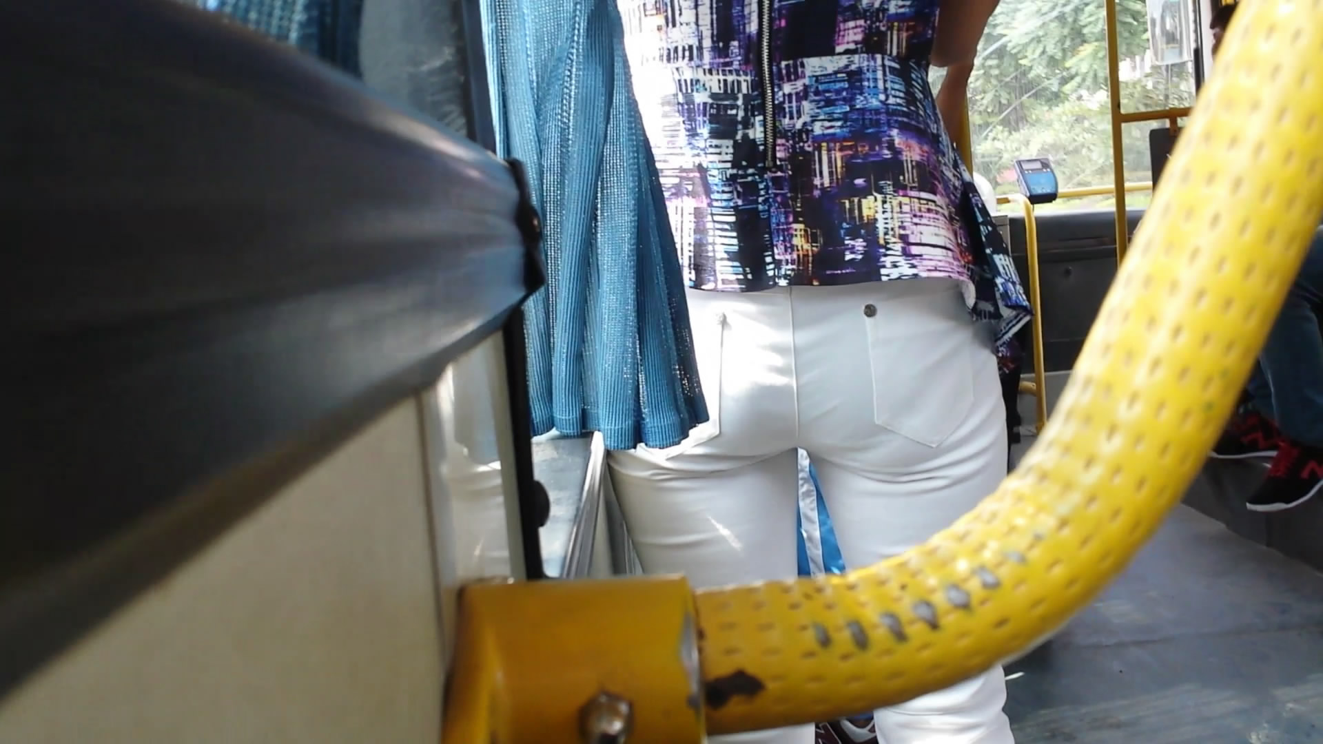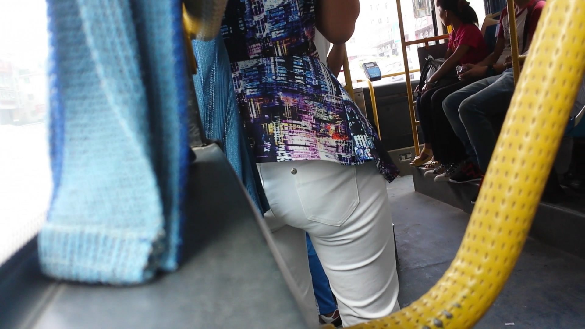 公交车上白色牛仔裤