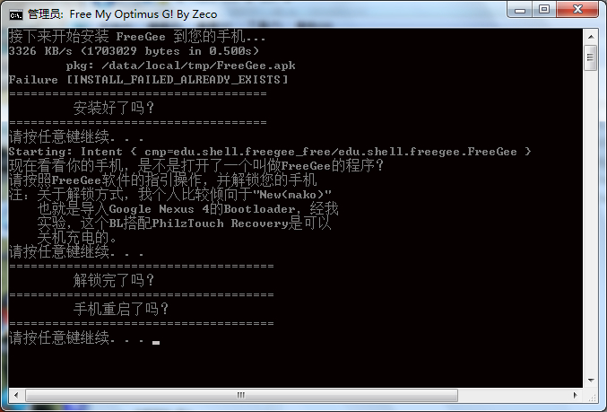 如果发现有“No space left on device”(设备上没有剩余空间)提示在“erasing old recovery and boot”(删除旧的recovery and boot)提示之后,可以忽略(也就是说解BL成功!),但是你现在没有提示 删除旧的