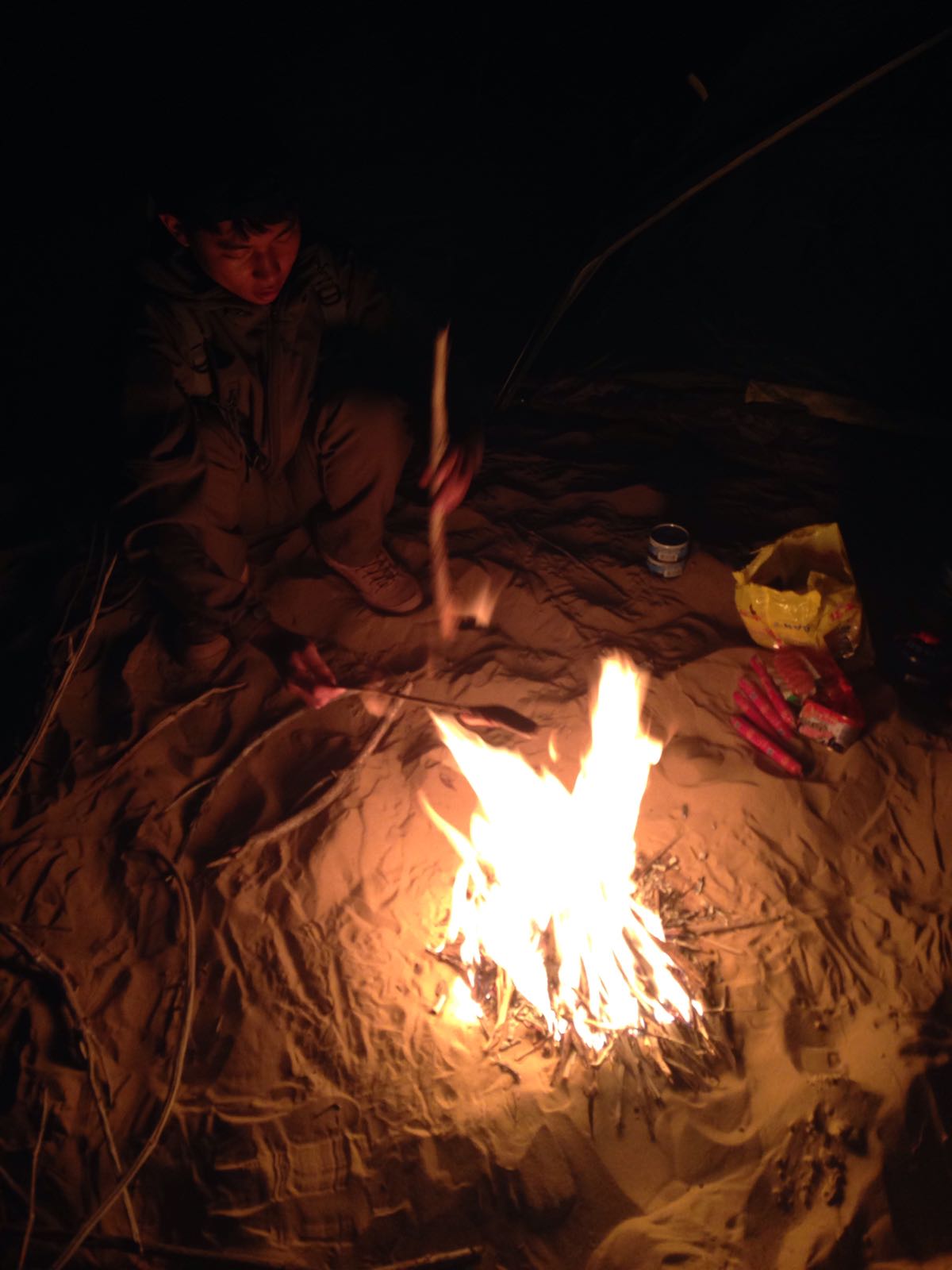 鉴于前一晚上的经验,今天把帐篷搭在一个窝风的地方,然后烤起了罐头,火腿肠,哈哈