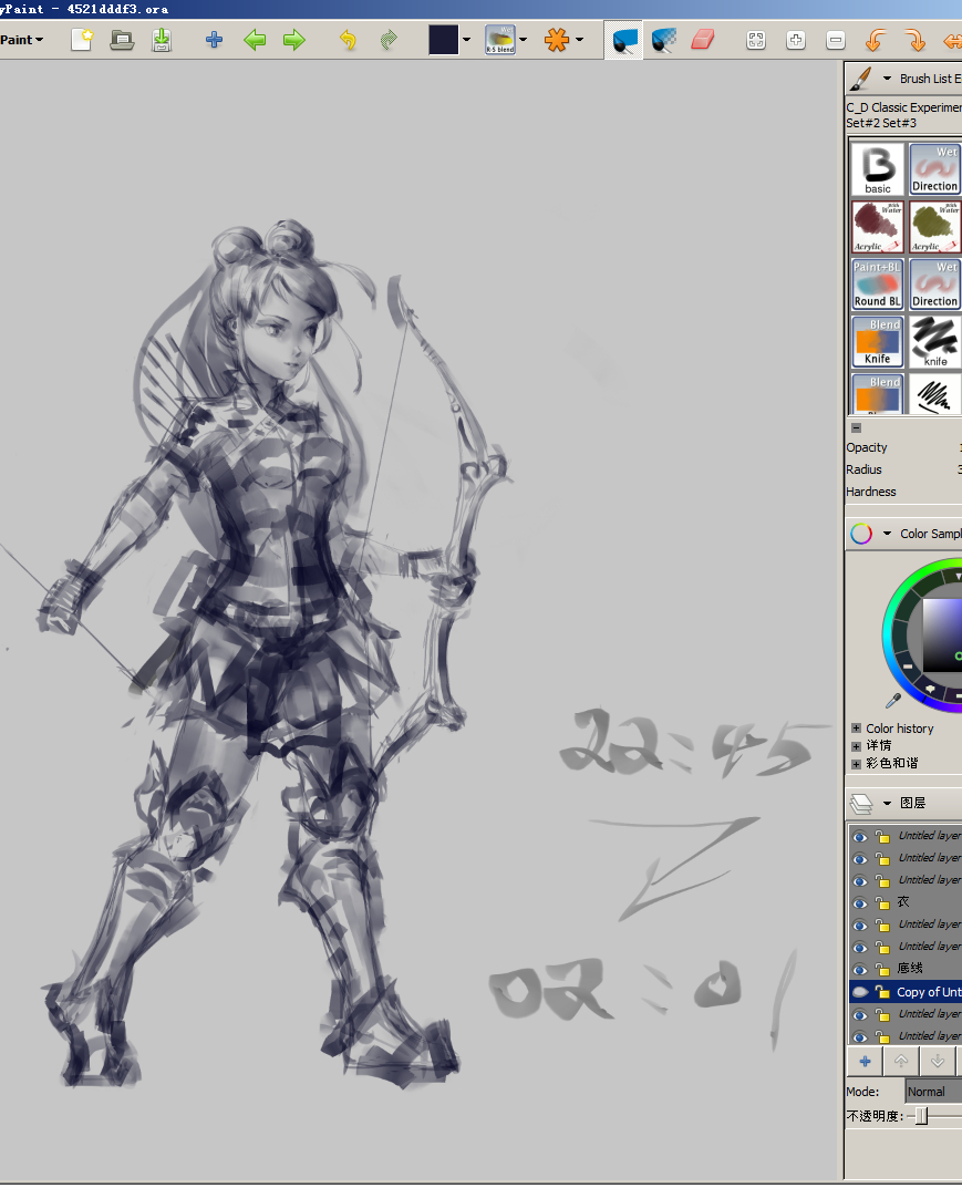 40分设定,无限制,即兴,刀笔,尖角刀,柔和阴影调和笔,眼角铅线,原型水平偏移没站稳