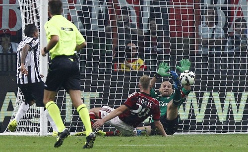 AC米兰第27分钟几乎首开纪录,蒙塔里左路斜传,本田圭佑在门前7米处头球被布冯神勇侧扑封出。第31分钟,特维斯传过顶球,佩雷拉右侧底线勾到门前,略伦特跟进射门被阿比亚蒂没收。第34分钟,略伦特做球,佩雷拉在门前20米处推射被阿比亚蒂封出。