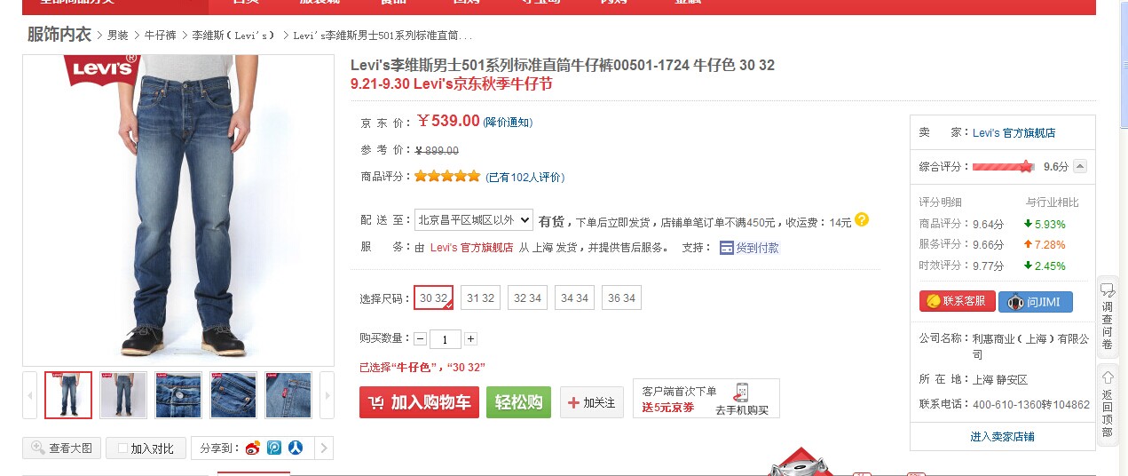 出Levi's李维斯男士501系列标准直筒牛仔裤00501-1724牛仔色30 32