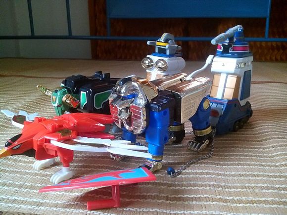超力战队电镀闪亮,双脚金属链条也完好,有盾牌和五个头盔但没有国产配的剑,另外狮子面部电镀上有部分是黑色,前几个月从云南一卖家处买来就是如此,另外牛的左角插口处缺了一片塑料,导致该牛角很松,可以自行502粘好。