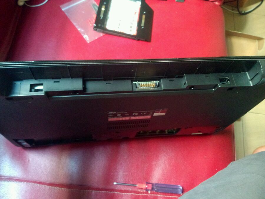 拆下机械硬盘换上固态硬盘、用一字螺丝刀褪掉电池后面的几个扣、然从C面电源键那个位置开始拆、翘起一个缝隙后用卡片沿着四周划开(这里是高难度、一定要小心、我撬断了两个扣、很脆弱)撬开后要轻轻拿起、里面有三根排线、排线都是卡扣式的、掰开卡扣拔出排线即可、